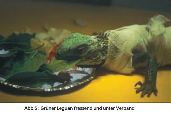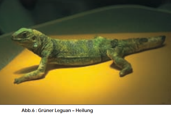 Da die riesigen Wundflächen über den ganzen Körper verteilt waren und sich nach einigen Wochen trotz ständiger Salbenkompressen harte, panzerartige Schorfflächen bildeten, die jede Bewegung für das Tier sehr schmerzhaft machten, wurden die Schorfplatten ständig vom Rand her zurückgeschnitten und verkleinert und sobald wie möglich abgelöst, d. h. sobald die darunter liegende Wunde nicht mehr blutete und eine zarte Epithelbildung erkennbar war. Während dieser Wochen wurde die Echse nicht nur mit Salbenkompressen, sondern auch mit Schaumstoffpolstern an den wenigen heil gebliebenen Hautstellen versehen, wodurch eine Berührung oder ein Bodenkontakt der schmerzenden Brandwunden vermieden wurde. Inzwischen waren die verbrannten und mumifizierten Zehen aller vier Füße zusammen mit der Haut abgelöst worden, auch der Schwanz war in den letzten drei Vierteln vertrocknet. Da ein Stück der Wirbelsäule aus dem Stumpf ragte und eine Infektion drohte, wurde ein Zentimeter des Stumpfes so amputiert, dass sich ein Regenerat bilden konnte, was bei einem Tier, das wegen fehlender Zehen auf seine Balance mehr angewiesen ist, wichtig erschien.
