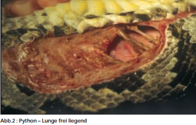 Wie gut das gelang, verdeutlicht die Tatsache, dass sämliche nun auch fotografisch dokumentierten Manipulationen ohne Narkose oder irgendeine Fixation erfolgten und höchstens gelegentlich ein paar Tropfen Lokalanästhetikum eingesetzt wurden. Einige Wochen nach der stationären Aufnahme begannen die verbrannten Hautpartien sich von der Unterlage zu lösen und wurden vorsichtig abgetragen. Die Schlange sah dabei zu und züngelte, zeigte aber keine Schmerzreaktionen. Auch bei den nächsten Sitzungen, wobei immer mehr zerstörtes Gewebe erkennbar wurde und entfernt werden musste, kroch sie nur gelegentlich etwas ungeduldig auf dem Operationstisch umher, was die Prozedur dann jeweils ein wenig zeitintensiver machte. Nach Abtragung der verkochten Interkostalmuskulatur zeigte sich wenige Tage später eindeutig, dass auch die freiliegenden Rippen entfernt werden mussten, da sie sich zu verfärben begannen.